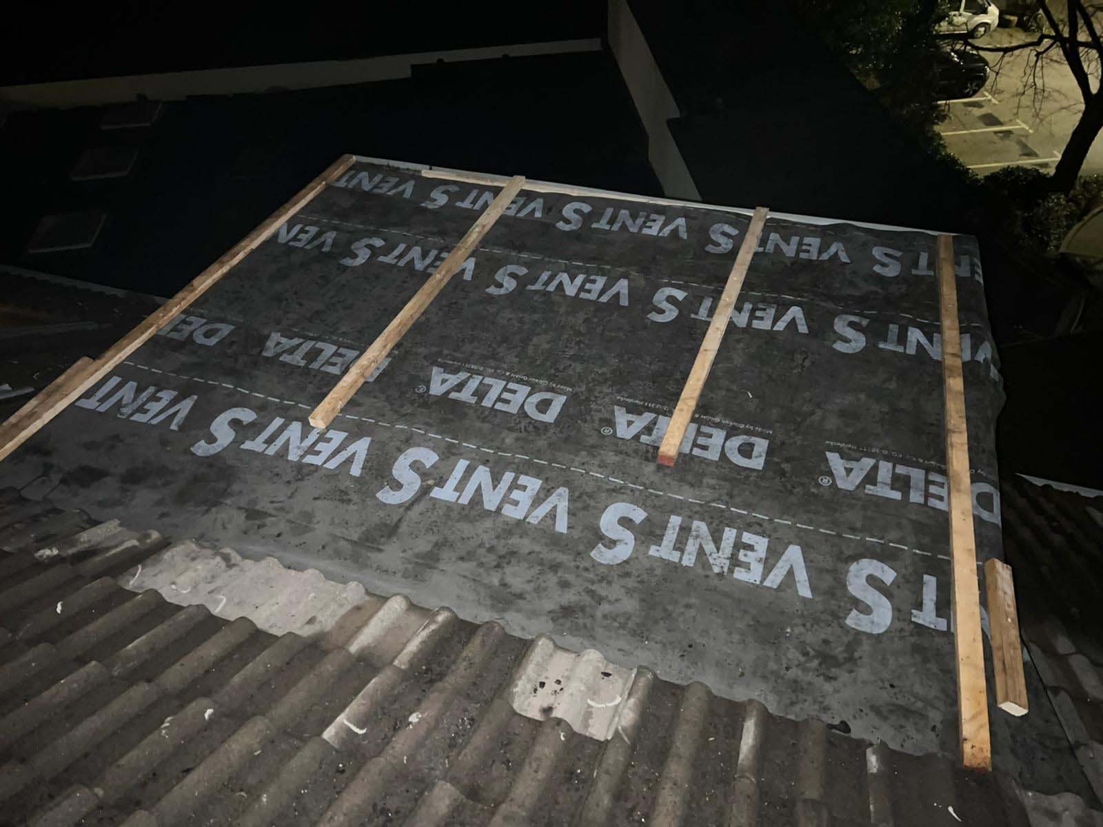 Bei einem unserer Kunden hat sich die Gaube gelöst und wir haben das Dach direkt notdürftig repariert. Unser Dachdecker-Notdienst war bis 1:30 Uhr in der Nacht im Einsatz.